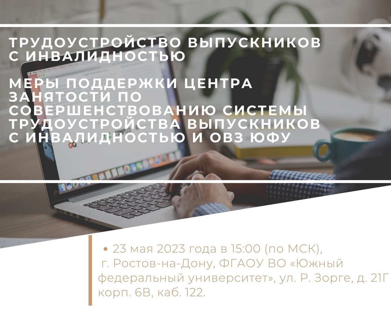 Сектор инклюзивного образования совместно с Call-центром РУМЦ ЮФУ и представителями ГКУ РО «Центр занятости населения города Ростова-на-Дону» проводит мероприятие «Трудоустройство выпускников с инвалидностью. Меры поддержки центра занятости по совершенствованию системы трудоустройства выпускников с инвалидностью и ограниченными возможностями здоровья ФГАОУ ВО «Южный федеральный университет»».